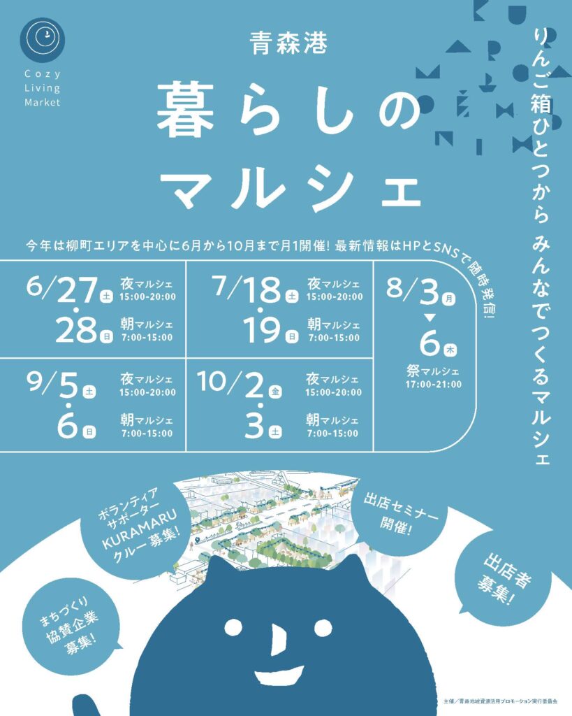 昨年多くの方にご出店いただき、来場していただきました「青森港暮らしのマルシェ」略して「くらマル」。今年は柳町通りを中心に6月から月1回開催します。